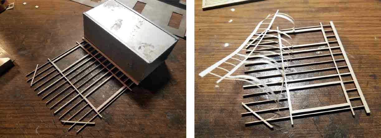 Building up the front wall sections (4) was not difficult but it was time consuming. All the doors and windows were assembled first. Then I started with one of the center stalls fronts. The assembly consisted of the 2 outer posts, two windows, the header for above the engine house doors, the small strip that runs between the windows and the top of the header and the base. I started by mounting the windows and center strip to the header. Building around the windows kept things square. Then I added the corner posts and the base. Once the glue was dry, I glued the base to the foundation and added the roof support beam. The engine house doors will be added later.